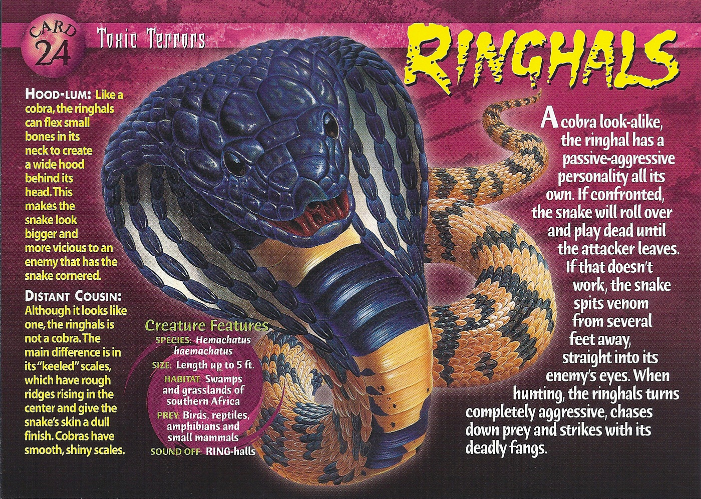 When faced with danger, it often plays dead by lying on its back with its tongue hanging out. Explore hghjim's photos on flickr. Uadjet was the cobra goddess of the prehistoric kingdom of buto and was considered a goddess of the underworld, justice and truth. Explore hghjim's photos on flickr. Hemachatus heamachatus venom;venom, hemachatus haemachatus;snake venom sepedon (hemachatus) hemachatus;ringhals cobra venom. How do king cobras communicate? Because a ringhals cobra shoots venom into victims' eyes it's also called this. They are called king cobras because they can kill and eat cobras. It is not a true cobra in that it does not belong to the genus naja, but instead belongs to the monotypic genus hemachatus. Ringhals — ring·hals riŋ.hals n a venomous african elapid snake (haemachates haemachatus) that is closely related to the true cobras but has carinate scales and that seldom strikes but spits or sprays. Instead of a straight canal ending in a long opening near the tip of each fang as in most cobras, the specialized fang of the spitting cobra has a canal that turns sharply… Spectabled cobra in all its beauty. .(african ringhals cobra) that specifically inhibits factor x (fx) activation by the extrinsic tenase complex (etc) and thus named as exactin.